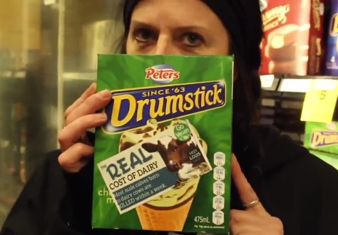 Dairy products also haven’t escaped the stickers. “Real cost of dairy: most male calves born to dairy cows are killed within a week,” one sticker read.