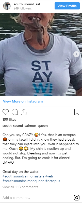Jamie Bisceglia was participating in a fishing derby in Washington when she got to hold on an octopus. And rather than keeping it on her head or arms, she decided to place the octopus on her face. I mean who would in their sane mind do such a thing.