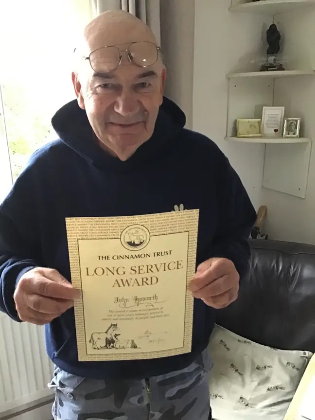 After serving as a volunteer for The Cinnamon Trust – a charity for the ill, the elderly, and their pets – for more than a decade, Mr. Howarth has been presented with a long service award.