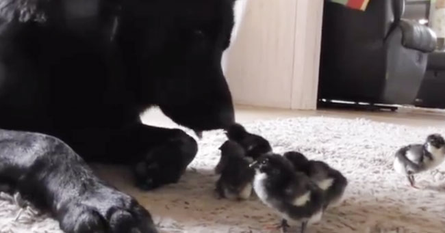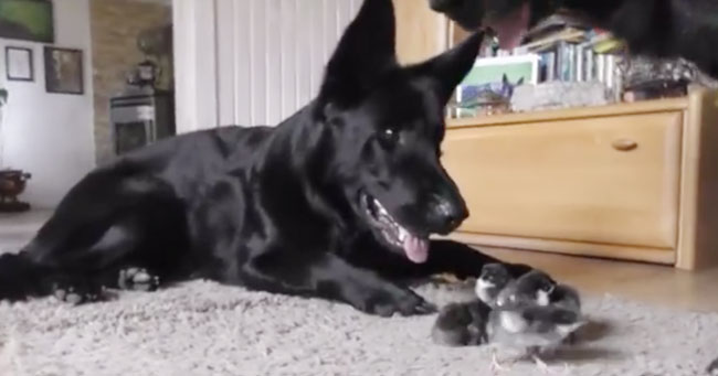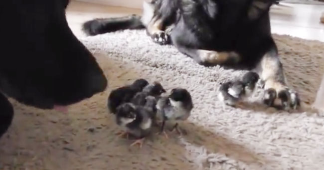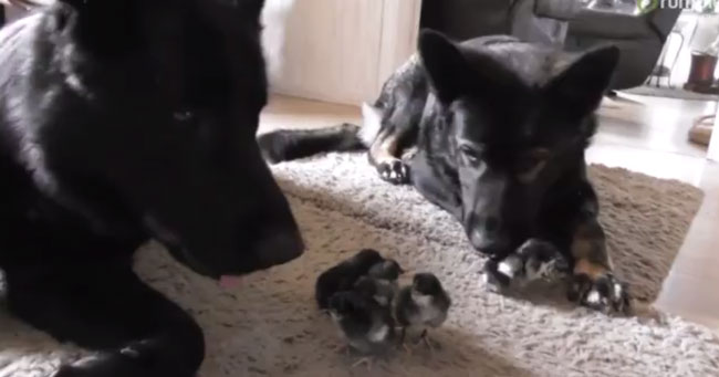 A video of two German Shepherds greeting cute newborn chicks is the cutest thing on the Internet.