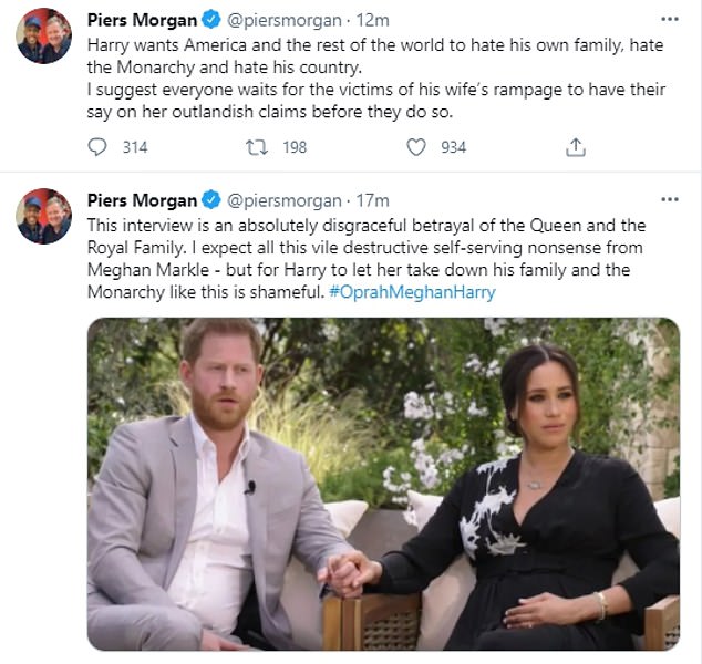 “This interview is an absolutely disgraceful betrayal of the Queen and the Royal Family. I expect all this vile destructive self-serving nonsense from Meghan Markle – but for Harry to let her take down his family and the Monarchy like this is shameful,” Piers wrote on Twitter.