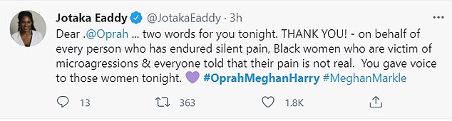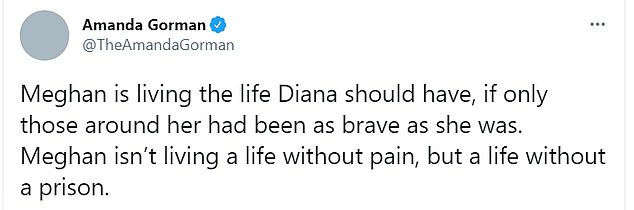 US poet Amanda Gorman also wrote: “Meghan is living the life Diana should have, if only those around her had been as brave as she was. Meghan isn’t living a life without pain, but a life without a prison.”