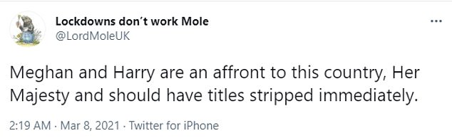 A third added: “I also feel that both Harry and Meghan should indeed be stripped of their Royal Titles and all benefits associated therewith. End.”