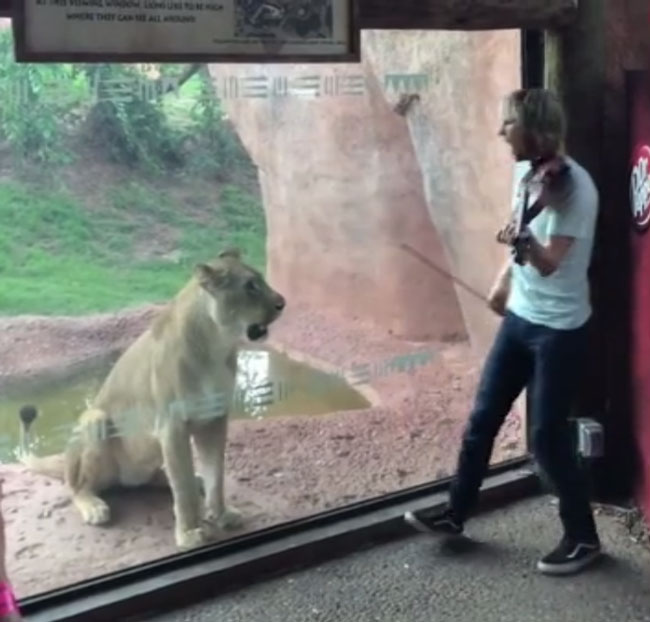 In the hilarious video which was shared online, the lioness can be seen leaping at the zoo glass to attack Kyle when he starts singing.