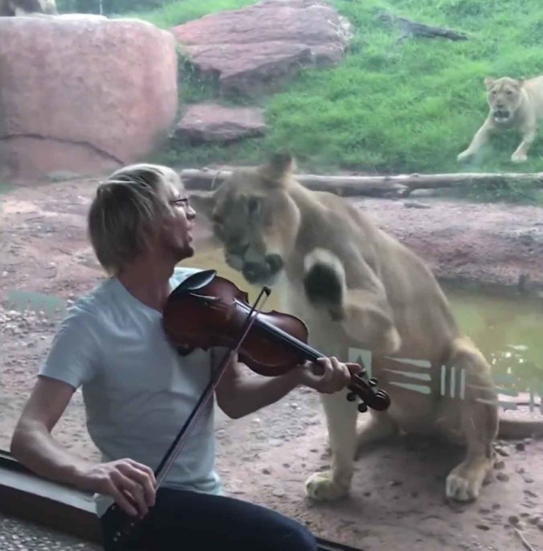 When Kyle started singing and playing his violin, the lioness at the Oklahoma zoo didn’t like it.