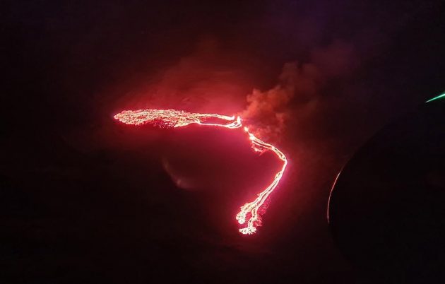 Footage posted by the Icelandic Meteorological Office – IMO on Twitter shows streams of red lava flowing out of a fissure in the ground.