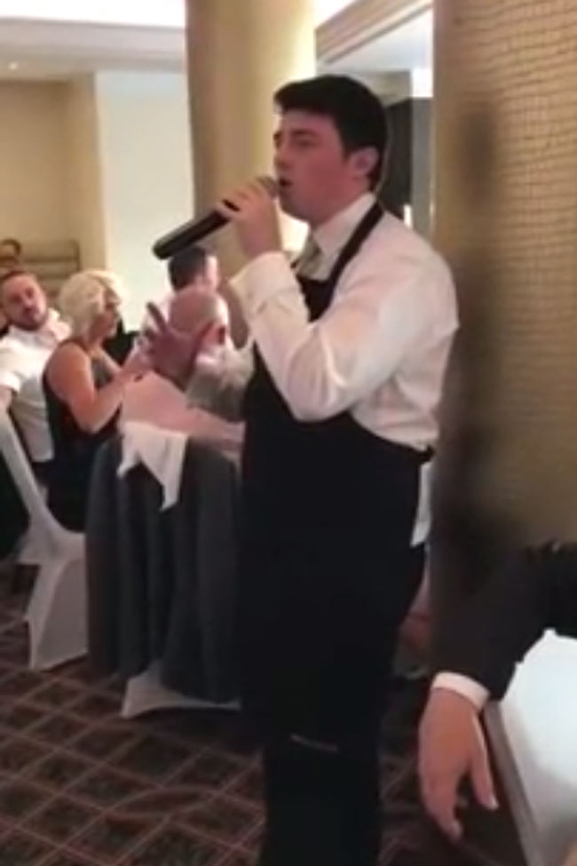 The video shows the waiter standing in the middle of the restaurant and singing for his customers.