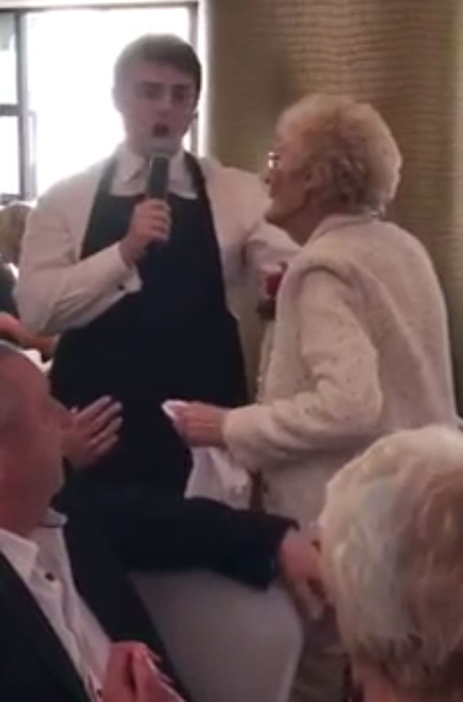 One wrote: ‘This brought me to tears what an amazing voice such talent’ while another added: ‘What a fabulous young man I could listen to him all day and so caring to the lady that came up to him’.