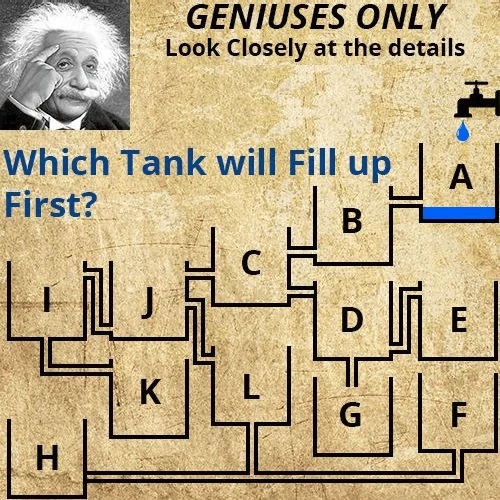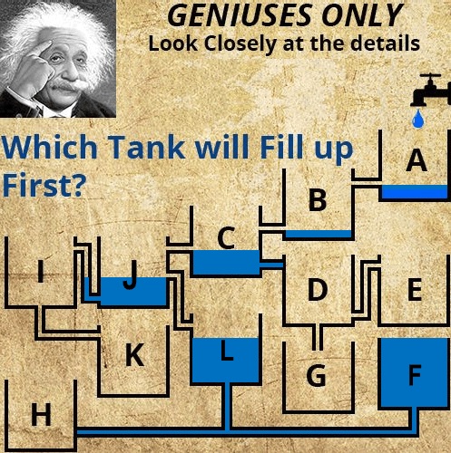 The tank that will fill up first is F. In the explanation below, you can see how the water will be distributed, and given that some of the water tanks are blocked off, this is the only solution there can be.