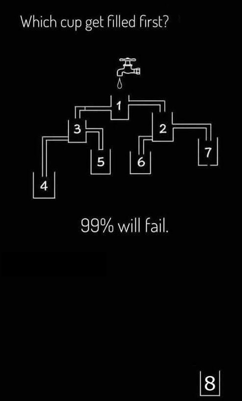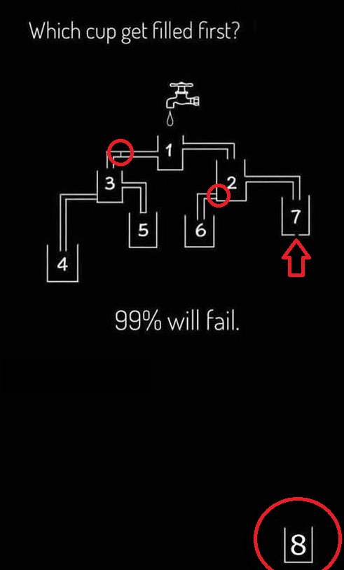 The answer, this time, is water tank number 8. Tank 3 and subsequent tanks are cut off from the water supply the same way as tank number 6. All of the water will therefore flow to tank 2 before making its way to tank 7 and finally 8.