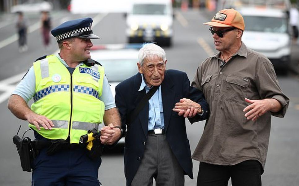 The old man is a veteran from World War 2 and after changing 4 buses, he was finally able to reach for the rally. The picture is so touching that even after needing support from a policeman and a stranger, the old man is willing to be a part of the rally.