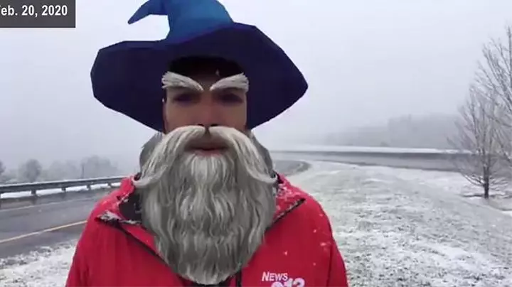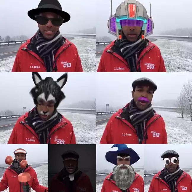 The weatherman was left with an absurd face and hilarious outlook after he accidentally recorded a snow report with some sort of filter turned on in his camera.