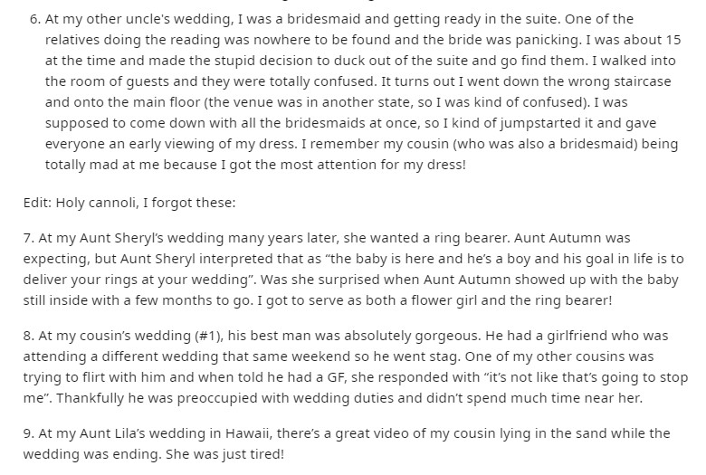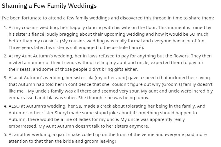 Reddit to share some of the weird things she witnessed at a few family weddings she attended.
