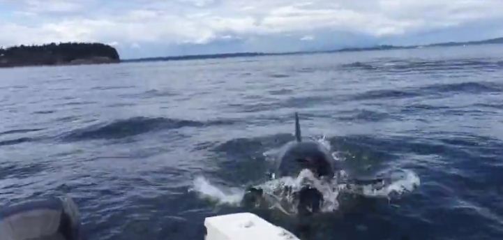 While they were appreciating the beauty of the nature and the depth of the ocean, a 20 feet friend came to see them and was ready to jump in the boat.