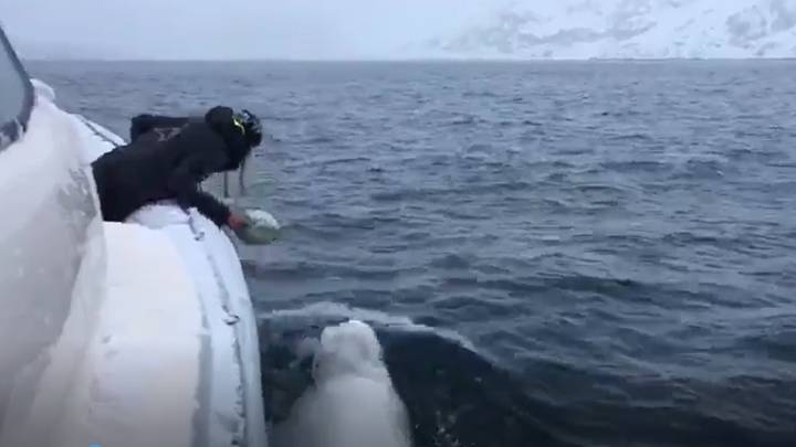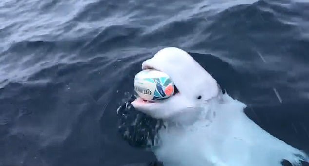 The clip shows the beluga whale catching the ball before bringing it back to the vessel for his ‘friends’ to throw again.