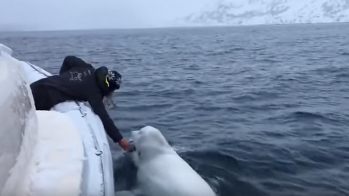 “Alone, malnourished, and injured, [Hvaldimir] roams the seas, seeking food & attention from people.”