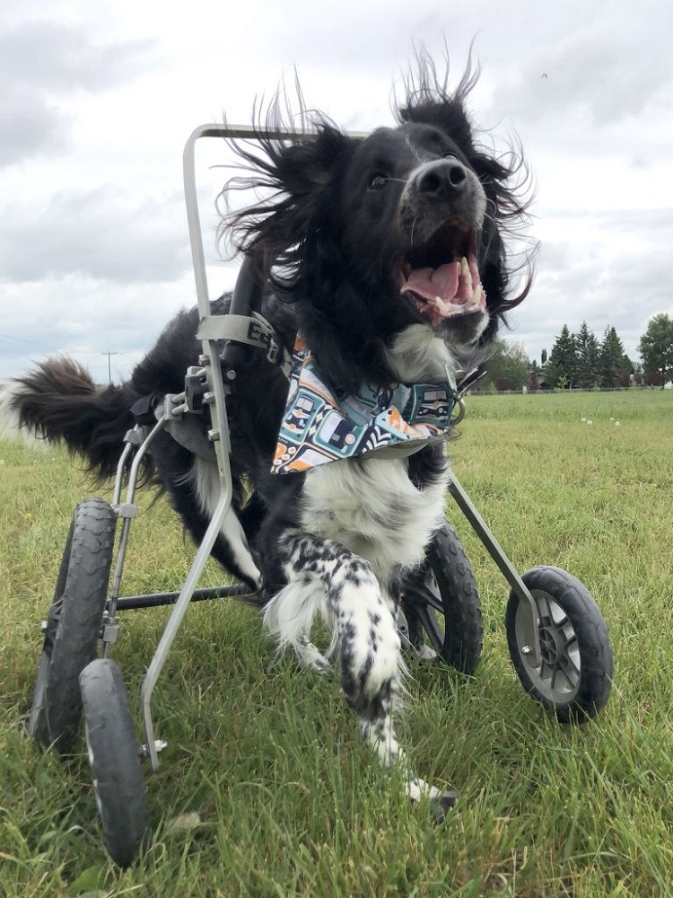 “We do find that a lot of dogs are timid around him initially due to his strange movements and his wheelchair, but after that, he is usually the most popular dog in the park, with a whole troop of his friends following him around.”