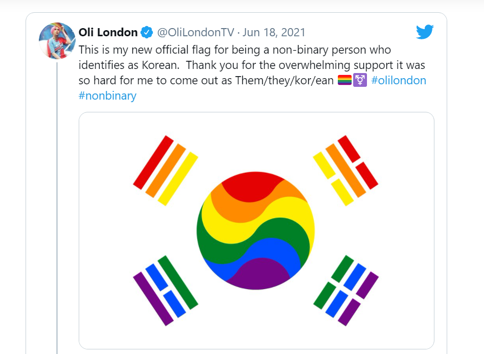 A user commented under London’s new flag saying “i am a person belonging to the non-binary umbrella, and this offends me A LOT, being Korean is a nationality, not a gender, you are making fun of all the non-binary umbrella, the neo pronouns and the entire lgbtqa+ community! really stop please”.