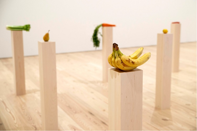 The artwork is comprised of 40 wooden pedestals with each one holding one type of fruit or vegetable. One had a wrinkly avocado while another one had a stalk of corn.