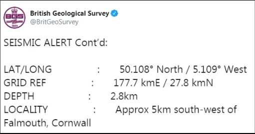 As confirmed by The British Geological Survey, the quake struck the depths of a region lying 3 miles southwest to Falmouth. The quake reportedly struck the interiors of the earth at a depth of 1.7 miles.