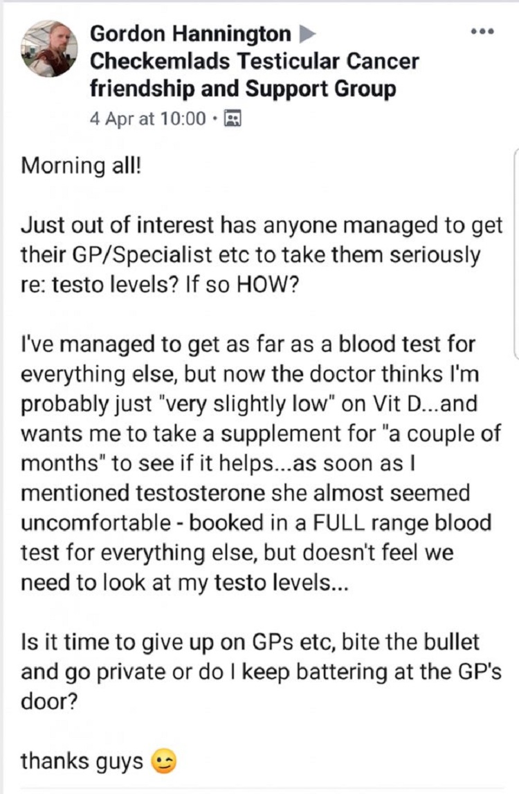 They even considered getting a private testosterone prescription but they couldn’t afford a private doctor. Gordon made a last-ditch effort in March this year to get his doctor to sign off on a testosterone test.