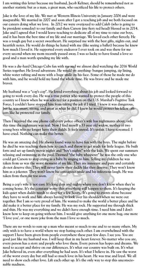 “I am writing this letter because my husband, Jacob Keltner, should be remembered not as another statistic but as a man, a great man, who sacrificed his life to protect others,” she wrote.