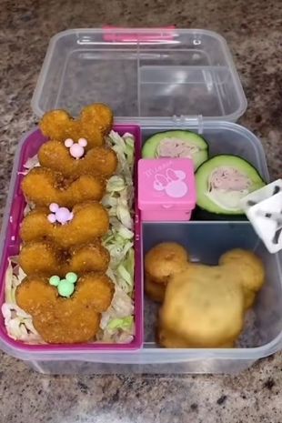 The packed lunch consisted of rice in the shape of a Mickey Mouse, salad, glazed sesame chicken, and Mickey nuggets. Liza also added crème cheese sandwich, ham, cucumber, and three mini KitKats in smaller compartments.