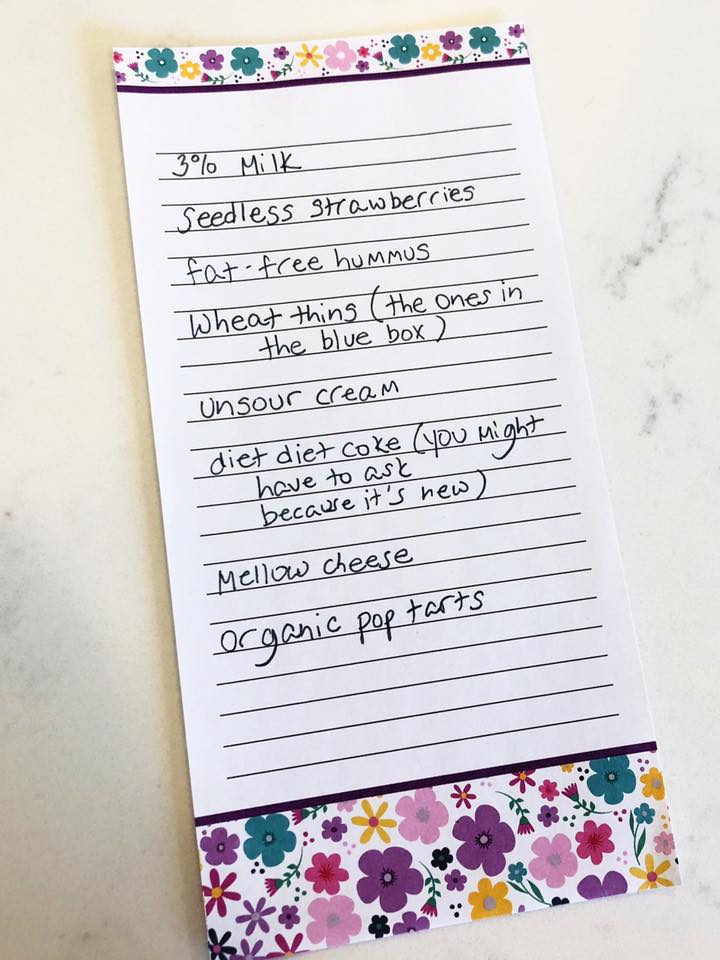 The items which she listed were, three per cent milk, seedless strawberries, fat-free hummus, wheat thins (the ones in the blue box), un-sour cream, diet coke (you might ask because it’s new), mellow cheese and organic Pop Tarts.