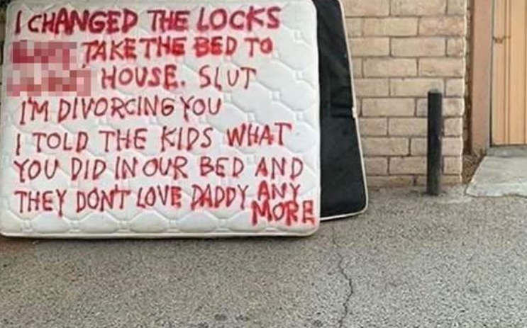 She wrote an anger-filled message on the mattress explaining what he has done and that she has told their children everything.