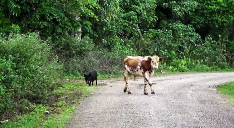 When the cow pauses to gaze at the tourist further, the pig steps into the bushes as if to hide until the coast is clear. But the cow lets out a bellow, apparently deciding that the tourist is not a threat, and walks past while still eyeing the tourist with curiosity.