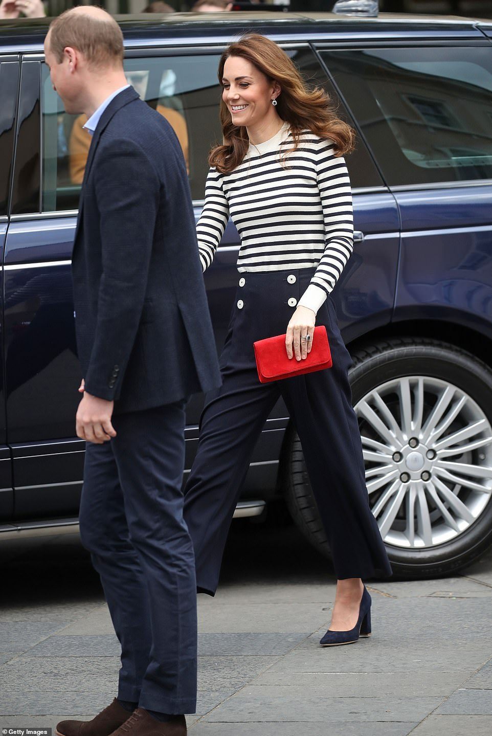Kate looked absolutely gorgeous in a chic outfit that consisted of a striped Breton top and LK Bennett trousers while a red clutch bag added a pop of color to her look.