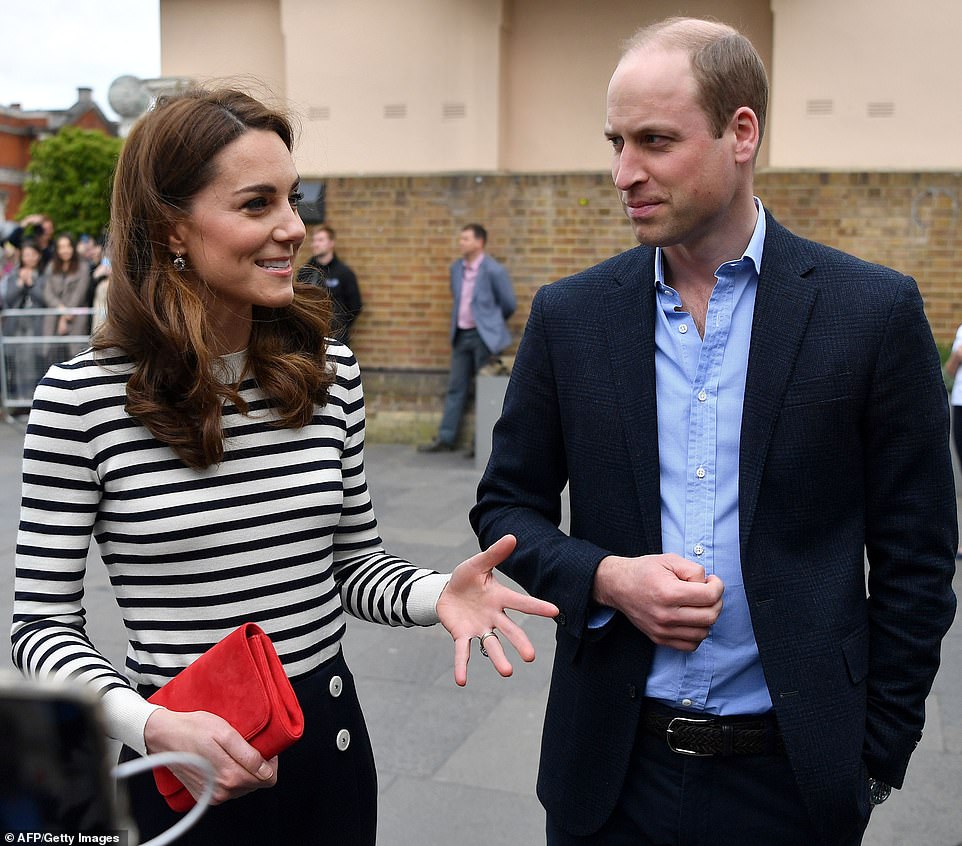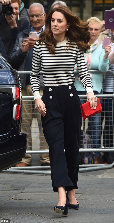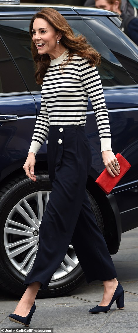 Kate looked absolutely gorgeous in a chic outfit that consisted of a striped Breton top and LK Bennett trousers while a red clutch bag added a pop of color to her look.