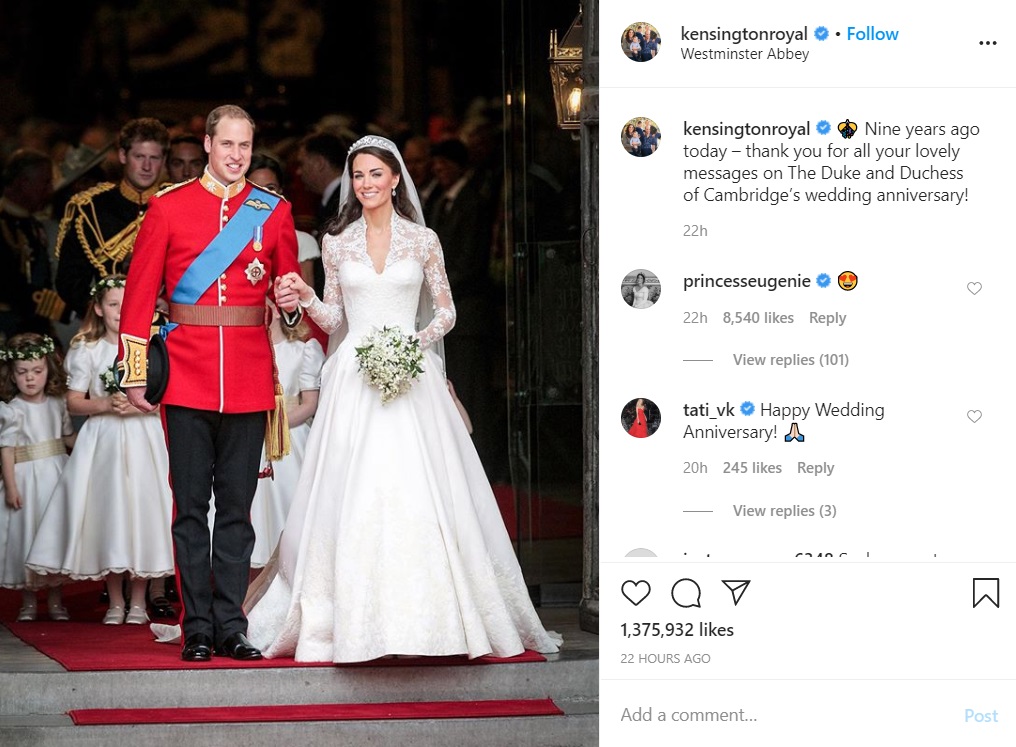 “Nine years ago today – thank you for all your lovely messages on The Duke and Duchess of Cabridge’s wedding anniversary!” the Kensington Palace wrote.