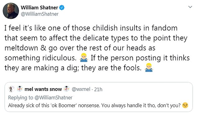 “I said I’d wear that badge with honor,” Shatner wrote. “Unlike you; the generations designation doesn’t define me nor am I too worried about getting labeled because it makes no difference to me.