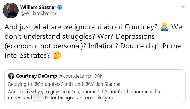 William Shatner entered into a heated argument with a millennial social media user who used the “Ok Boomer” phrase while responding to a comment the actor made about online trolls.