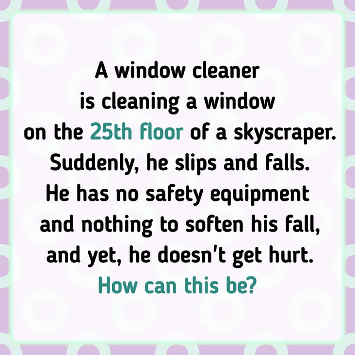 “A window cleaner is cleaning a window on the 25th floor of a skyscraper. Suddenly, he slips and falls. He has no safety equipment and nothing to soften his fall, and yet, he doesn’t get hurt. How can this be?”