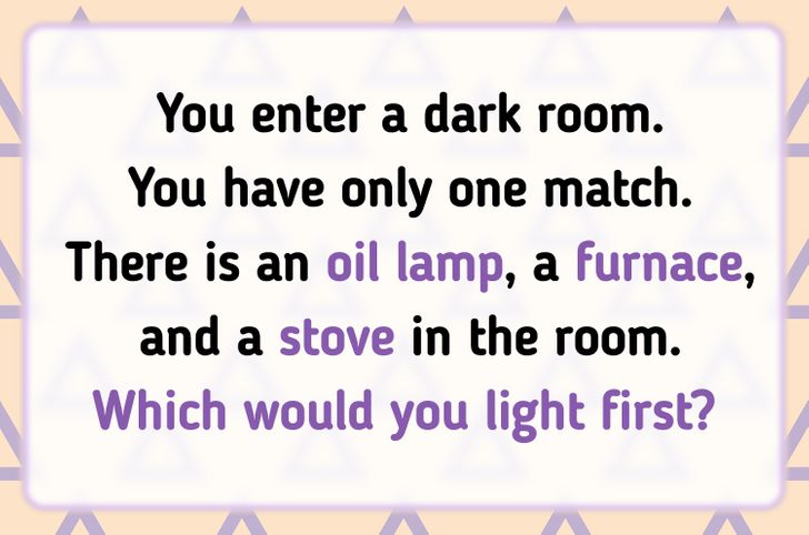 “You enter a dark room. You have only one match. There is an oil lamp, a furnace, and a stove in the room. Which would you light first?”