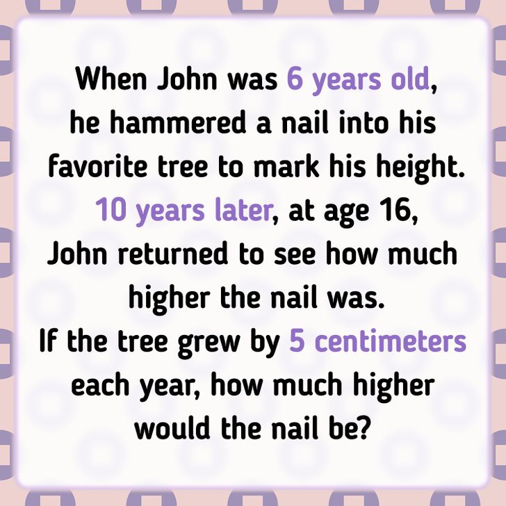 “When John was 6 years old, he hammered a nail into his favorite tree to mark his height. 10 years later, at age 16, John returned to see how much higher the nail was. If the tree grew by 5 centimeters each year, how much higher would the nail be?”