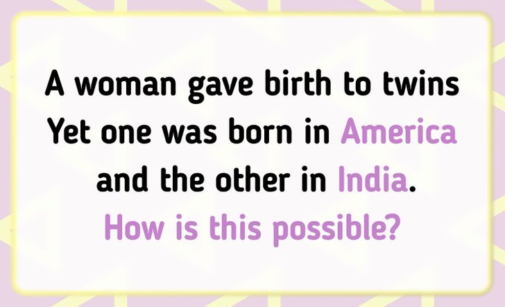 “A woman gave birth to twins. One was born in America and the other in India. How is this possible?”