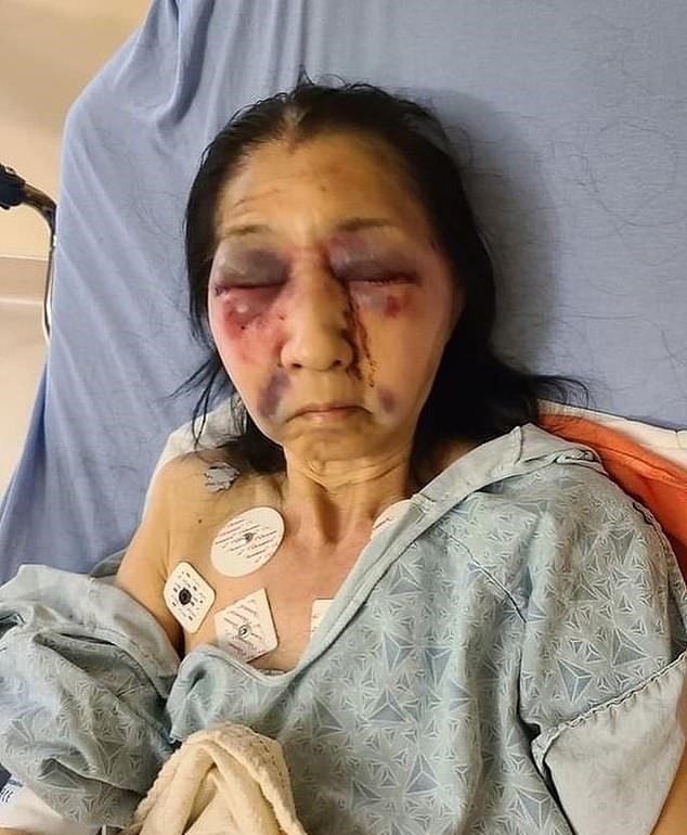 A 70-year-old woman was severely beaten by a 23-year-old racist bus passenger who thought she was an Asian-American, her heartbroken son said.