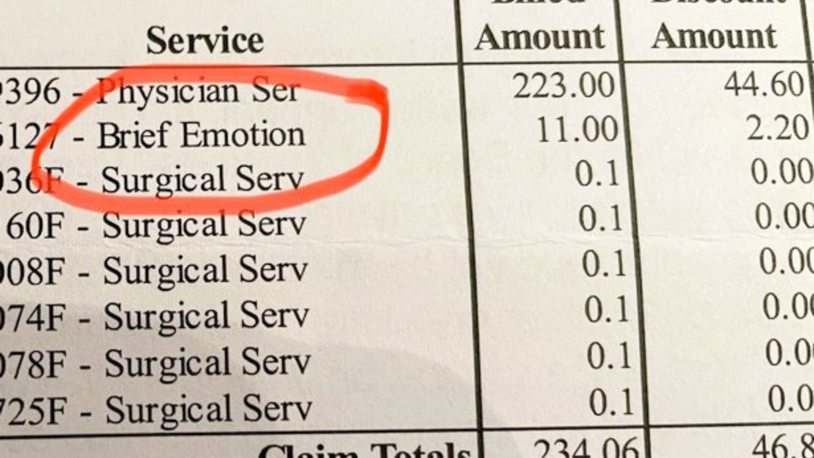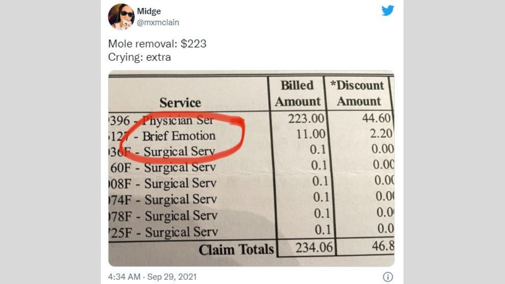 She shared a photo of the invoice she received from the hospital following her basic mole removal procedure. The bill had a breakdown of all the charges. However, one of the particulars named “Brief Emotion” was for $11.