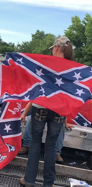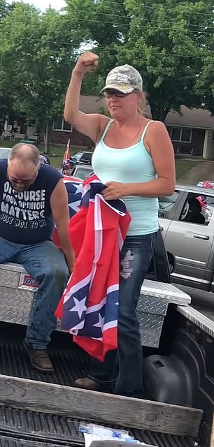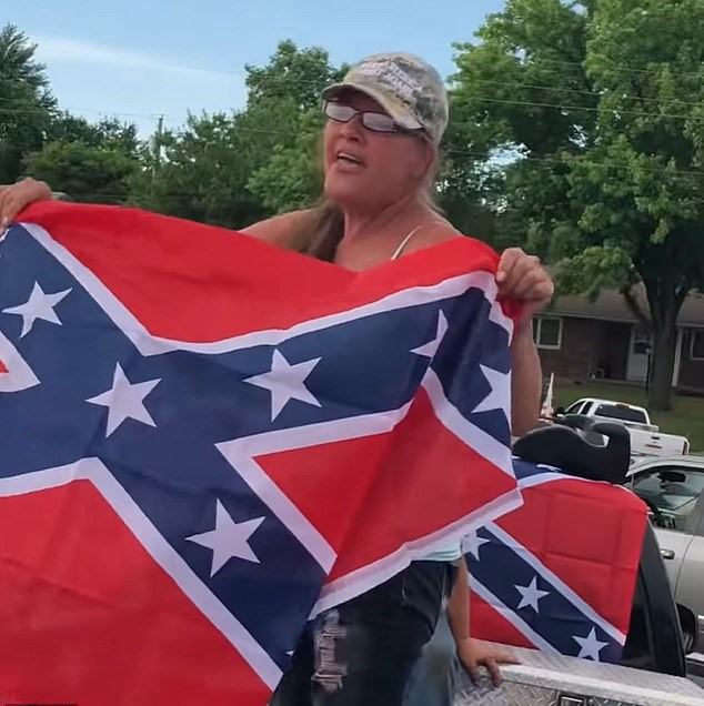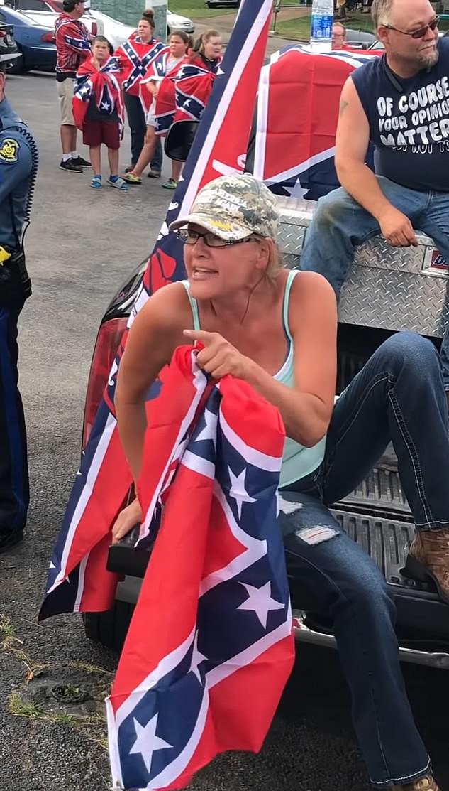 The clip shows the Confederate flag-waving woman, identified as Kathy Bennett, shouting ‘KKK belief’ when challenged by BLM supporters.