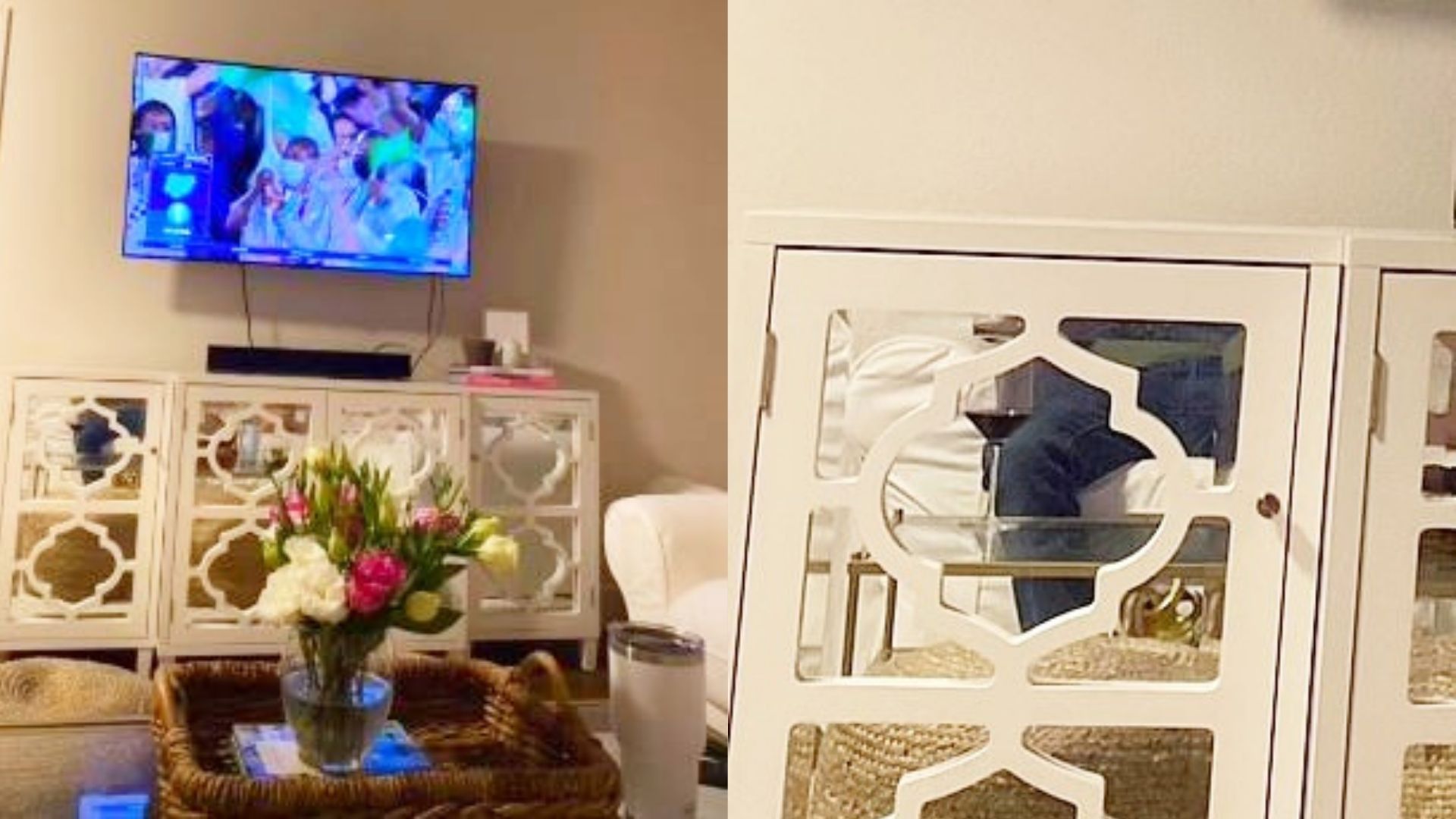 When Megan zoomed in on the photo, she noticed a glass of red wine in the reflection of a feminine cabinet and what appeared to be a woman’s leg.