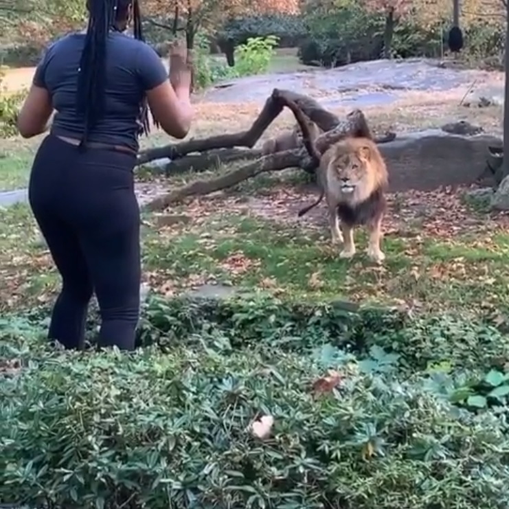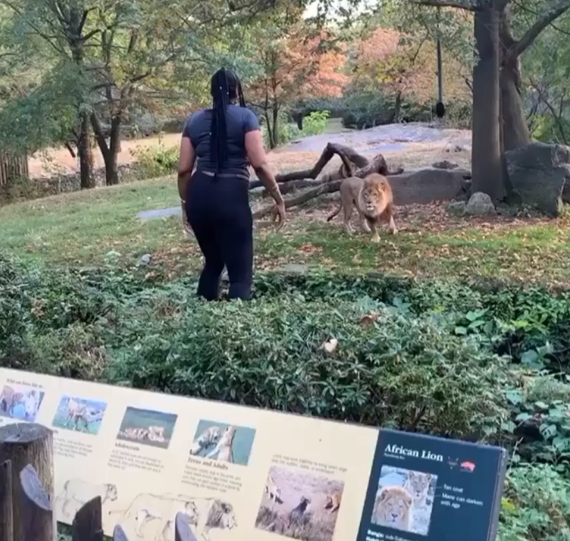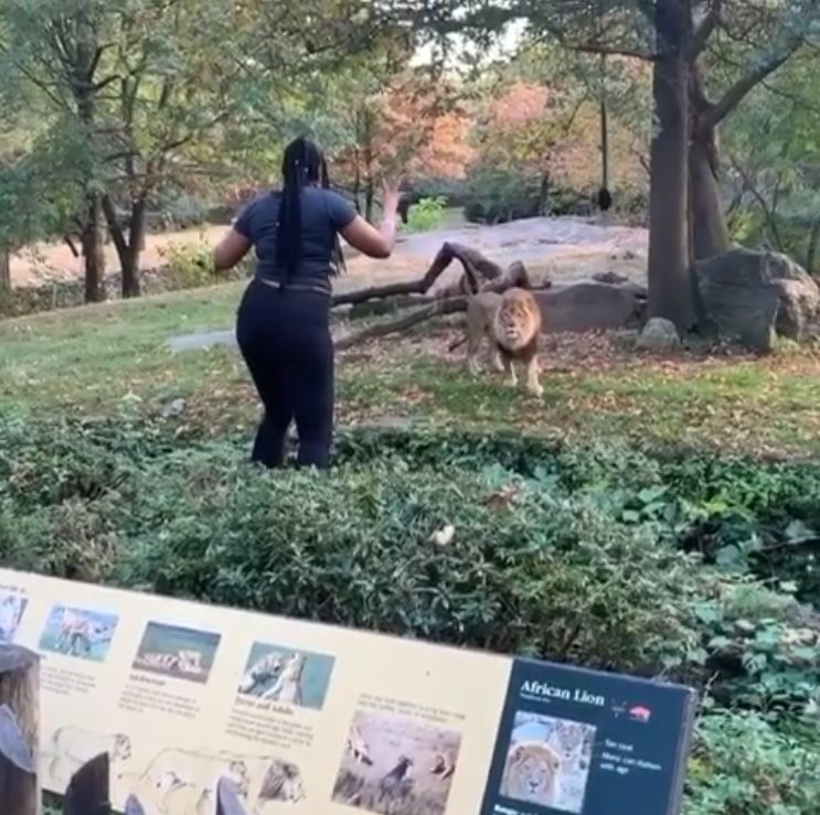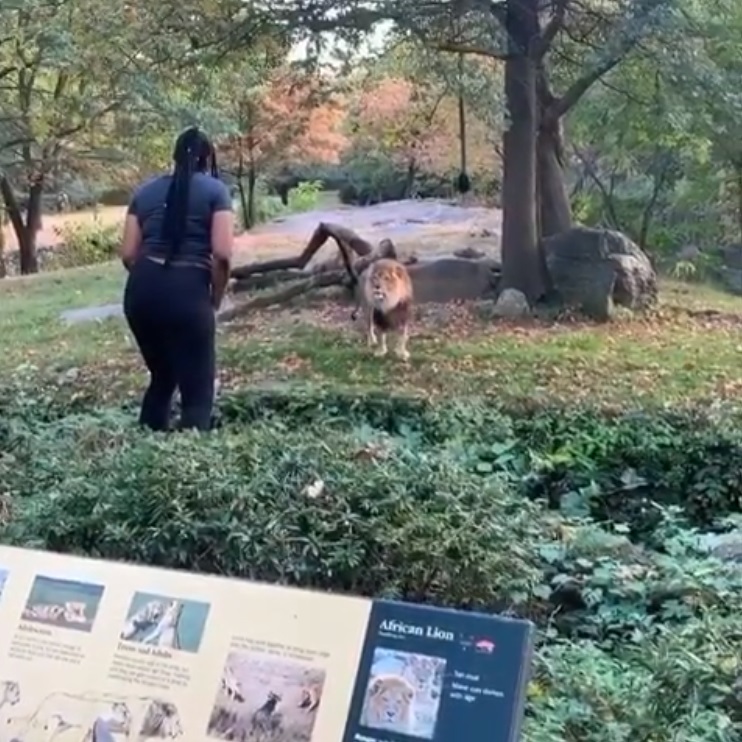 Despite a deep trench preventing the lion from attacking her, the woman put herself in tremendous danger as things could easily spiral out of control if she slipped and fell down.