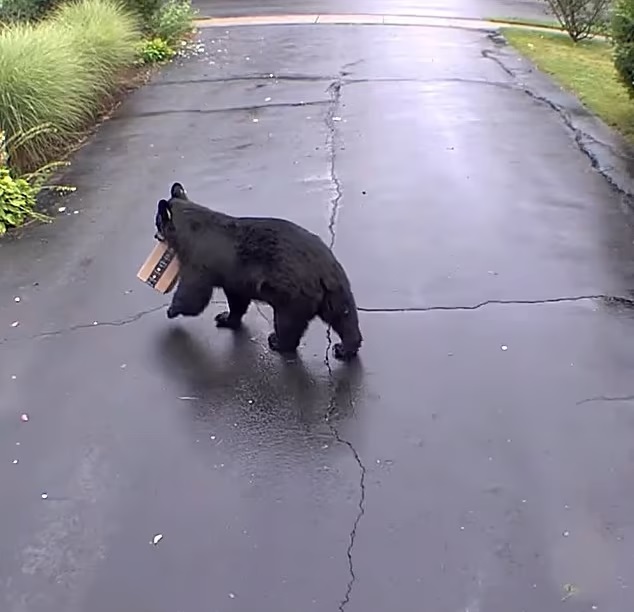 As seen in the footage Kristin shared online, a black bear walked up to her property before biting into her package and walking away with it.