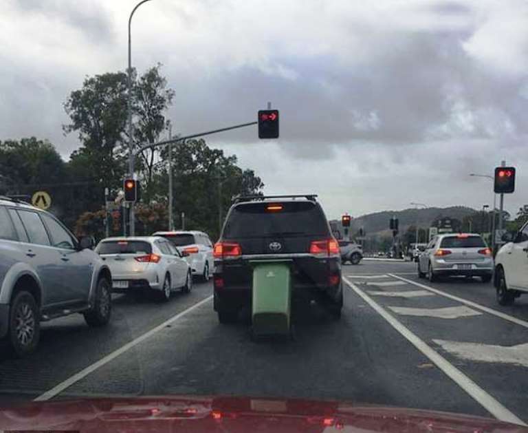 The female driver was seen towing her win from her car on a busy road in Brisbane, Australia. She was on her way to the station and had seemingly forgotten to remove her bin before she left her house.