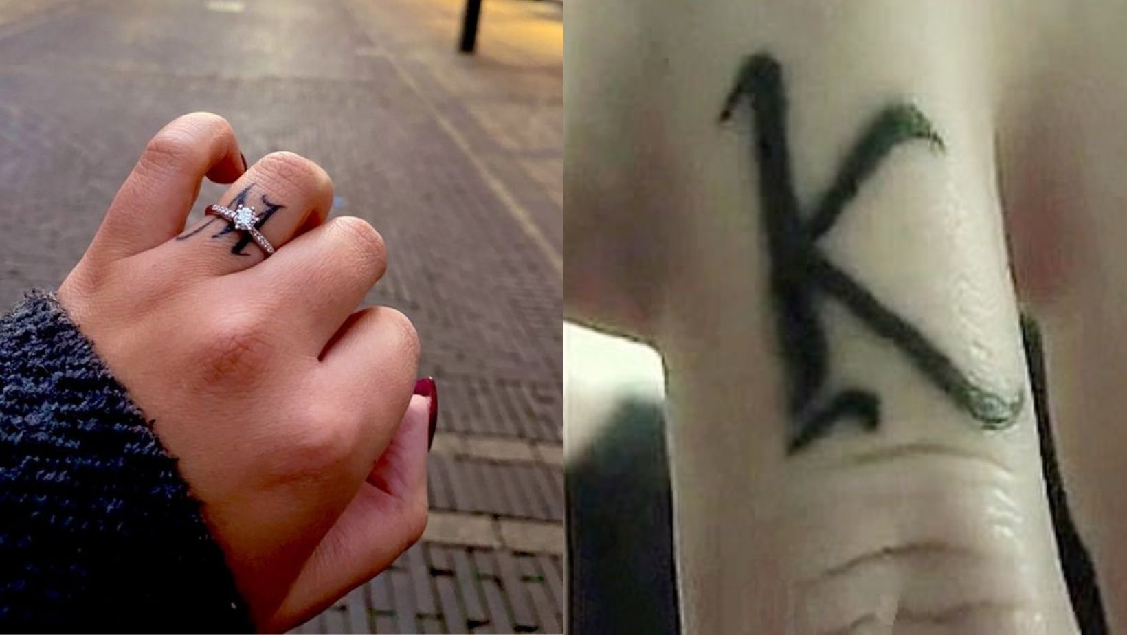In addition to a flashy engagement ring, the couple has marked their commitment with the letter “W” and “K” inked on their ring finger.