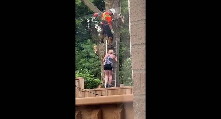 The incident happened in Yichun City in Kitchener, Ontario, Canada. As can be seen in the video, the contractor had to stop cutting the tree because his chainsaw got stuck. The woman below him on the ladder was about to hand over something when suddenly, all he** breaks loose as chainsaw, branch, and another tree start crashing down on her.