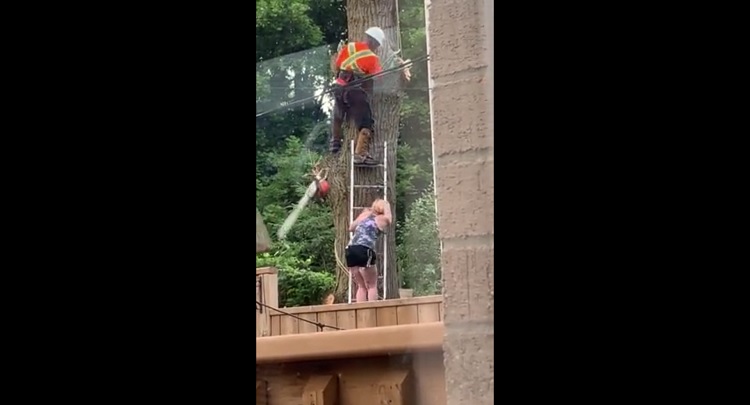 “The woman is hit by the falling chainsaw. The falling branch just misses her and the overhead power lines. The branch swings into a second ladder, and the two strike the man with enough force to send his safety helmet flying. Finally, the woman falls almost 10’ with some kind of tool in her mouth.