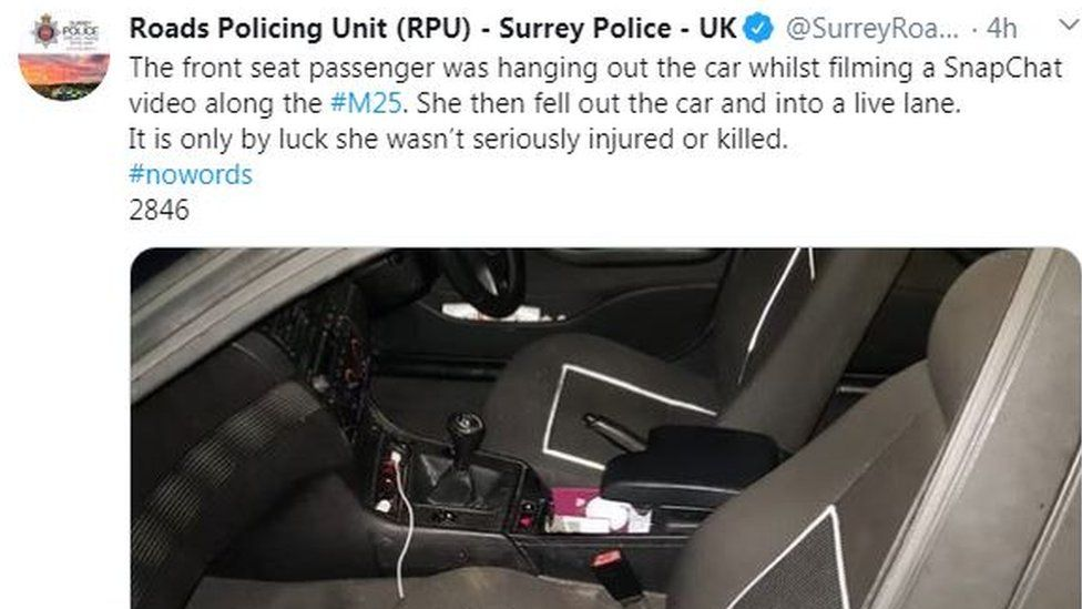 Surrey Police shared the story on Twitter and wrote: “The front seat passenger was hanging out the car whilst filming a Snapchat video along the #M25.